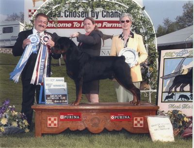 At the age of 2 Kobe won Best of Winners at the 2005 ARC National Specialty defeating hundreds of class dogs and bitches . He then was awarded Select defeated only by the then AKC #1 Rottweiler over 100 Specials. He finished with all. point majors .